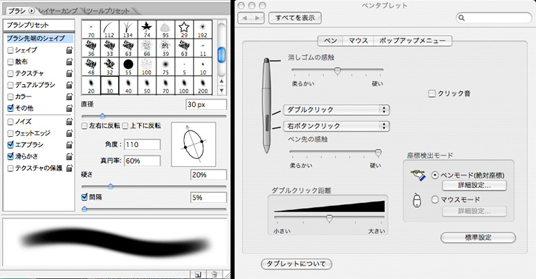 一通りできたらタブレットの筆圧をONにして、毛先を硬めに設定します。